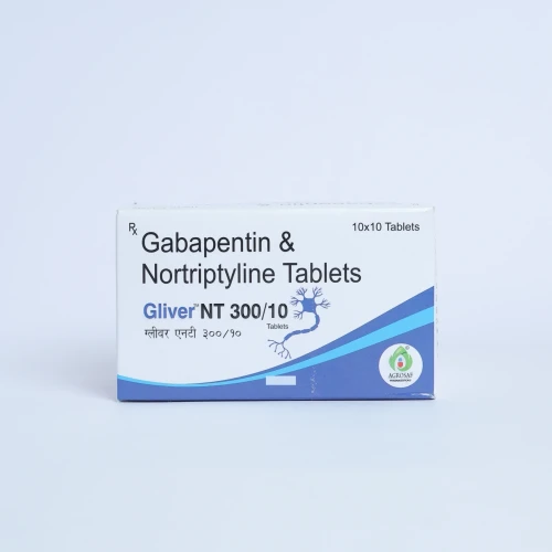Description: GLIVER NT 300/10 Tablet combines Gabapentin 300mg and Nortriptyline 10mg, a dual-action medication for managing neuropathic pain and nerve-related disorders. Gabapentin helps calm overactive nerve signals, while Nortriptyline, a tricyclic antidepressant, enhances pain relief and improves nerve function. This combination is commonly prescribed for diabetic neuropathy, post-herpetic neuralgia, and chronic nerve pain.