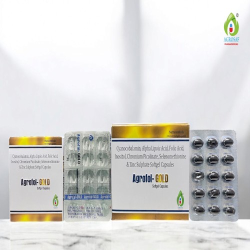 | Description: | AGROFOL-GOLD Softgel Capsules are a scientifically formulated nutraceutical supplement designed to support nerve health, metabolic balance, and antioxidant protection. This advanced formulation combines Alpha Lipoic Acid, Cyanocobalamin (Vitamin B12), Folic Acid, Inositol, Chromium Picolinate, Selenomethionine, and Zinc to help manage neuropathy, improve cellular function, and enhance overall well-being. It is widely recommended for individuals with diabetic neuropathy, nutritional deficiencies, and oxidative stress-related conditions. |