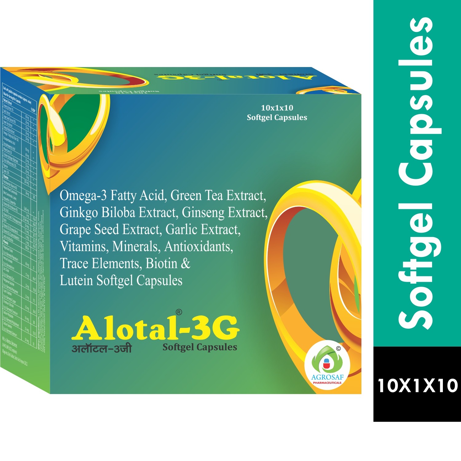 | Description: | ALOTAL-3G Softgel Capsules is a comprehensive multivitamin, multimineral, antioxidant, and omega-3 nutraceutical formulation designed to support overall health, immunity, energy, and cardiovascular wellness. Enriched with Ginseng, Ginkgo Biloba, and Green Tea extracts, it helps enhance mental alertness and stamina. Omega-3 fatty acids (EPA & DHA) support heart and brain health, while antioxidants like Grape Seed Extract and Citrus Bioflavonoids protect against oxidative stress. The addition of essential vitamins, minerals, and probiotics ensures complete nutritional support for daily health and vitality. |