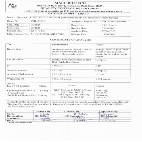 Description: Cyptomac Drop is a pediatric appetite stimulant formulated with Cyproheptadine (1.5 mg) and Tricholine Citrate (55 mg). Cyproheptadine is an antihistamine with appetite-stimulating properties, while Tricholine Citrate supports liver function and promotes bile secretion, aiding digestion. This combination is beneficial for children with poor appetite, underweight issues, or mild digestive concerns. It helps improve overall growth and nutrition in children.