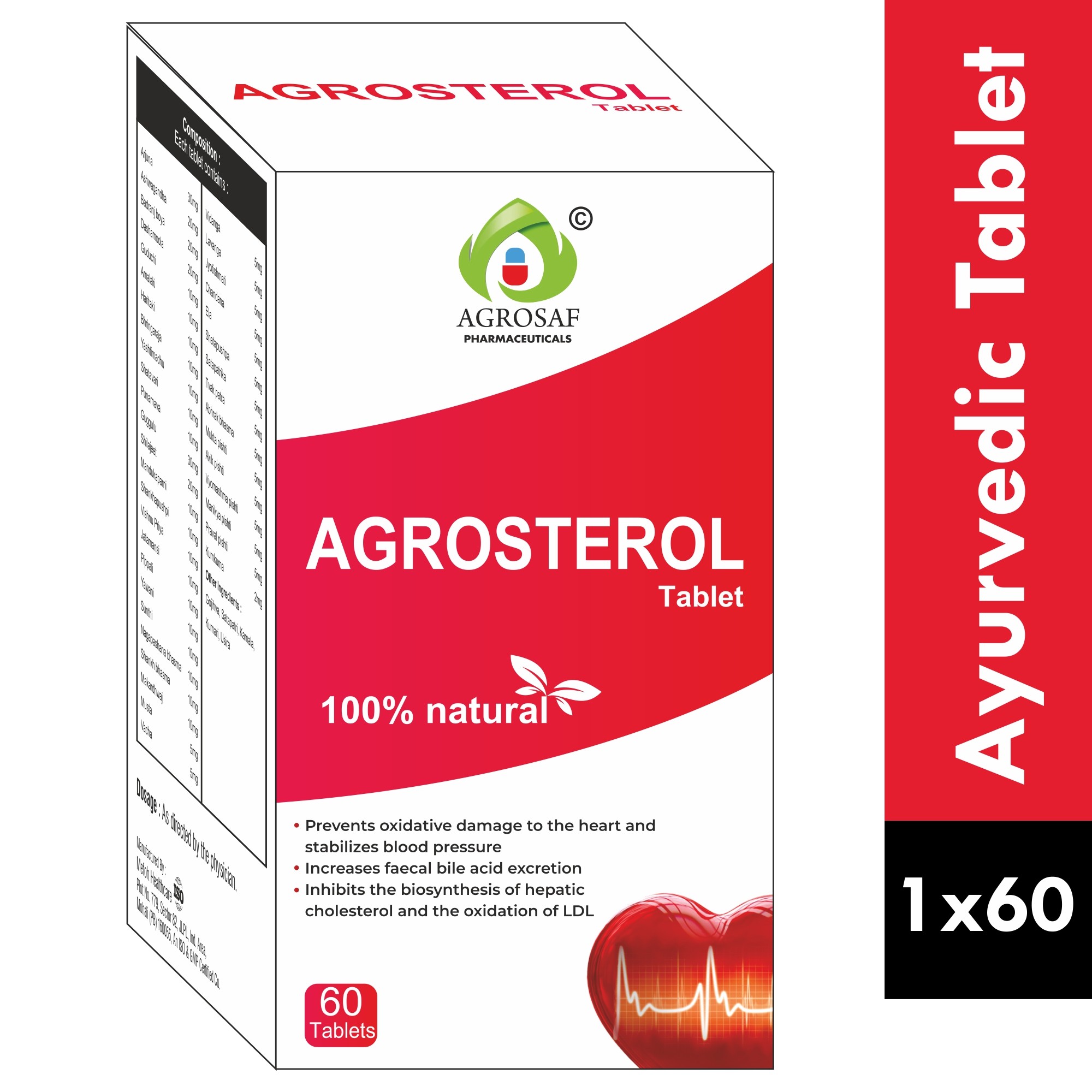 Arjuna 30mg,Ashvagandha 20mg,Badranj boya 20mg,Dashamoola 20mg,Guduchi 10mg,Amalaki 10mg,Haritaki 10mg,Bhringaraja 10mg,Yashtimadhu 10mg,Shatavari 10mg,Punarnava 10mg,Guggulu 30mg,Shilajeet 20mg,Mandukaparani 10mg,Shankhapushpi 10mg,Vishnu Priya 10mg,Jatamansi 10mg,Pippali 10mg,Yawani 10mng,Sunthi 10mg,Nagapashana bhasma 10mg,Shankh bhasma 10mg,Makardhwaj 10mg,Musta 5mg,Vacha 5mg,Vidanga 5mg,Lavanga 5mg,Jyotishmati 5mg,Chandana 5mg,Ela 5mg,Shatapushpa 5mg,Satapatrika 5mg,Tvak patra 5mg,Abhrak bhasma 5mg,Mukta pishti 5mg,Akik pishti 5mg,Vyomashma pishti 5mg,Manikya pishti 5mg,Praval pishti 5mg,Kumkuma 2mg,(other ingrediants)Gojiha ,Satapatri ,Kamela ,Kumari ,Ushira