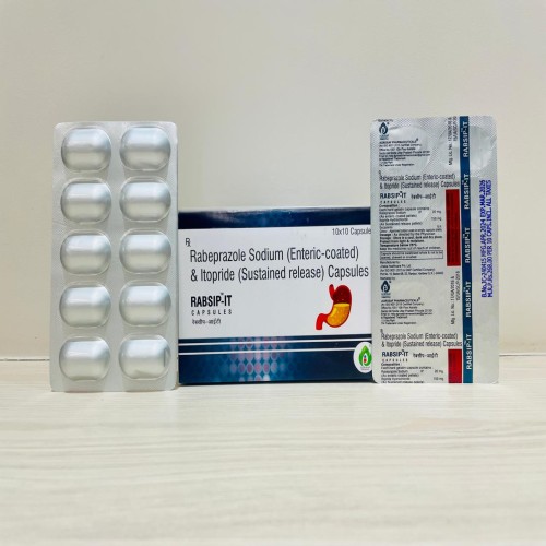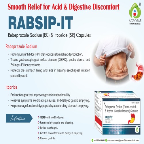 | Description: | RABSIP IT Capsule is a combination medicine formulated for the management of acid-related gastrointestinal disorders and delayed gastric emptying. It contains Rabeprazole 20 mg, a proton pump inhibitor (PPI) that reduces stomach acid production, and Itopride 150 mg, a prokinetic agent that enhances gastric motility. This combination is effective in treating gastroesophageal reflux disease (GERD), functional dyspepsia, and other conditions associated with heartburn, acidity, and bloating, providing fast relief and improving digestive comfort. |