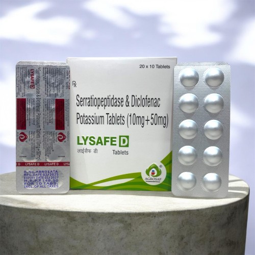 | Description: | LYSAFE-D Tablet is a combination of Diclofenac Potassium 50mg, a fast-acting non-steroidal anti-inflammatory drug (NSAID), and Serratiopeptidase 10mg, a proteolytic enzyme that helps reduce swelling and inflammation. This formulation is widely used for managing pain, inflammation, and edema associated with musculoskeletal conditions, post-surgical recovery, dental procedures, and injuries. The combination provides rapid pain relief while promoting faster healing by reducing tissue inflammation. |