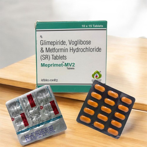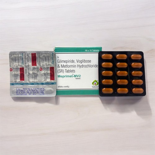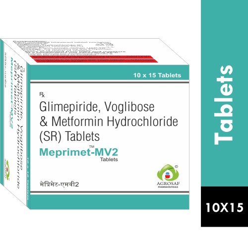 | Description: | MEPRIMET MV2 Tablet is a triple-combination antidiabetic medication containing: Glimepiride 2mg – a sulfonylurea that stimulates insulin secretion from pancreatic beta cells. Metformin (SR) 500mg – a biguanide that reduces hepatic glucose production and improves insulin sensitivity, with sustained-release action for prolonged control. Voglibose 0.2mg – an alpha-glucosidase inhibitor that delays carbohydrate absorption in the intestine, helping control post-meal blood sugar spikes. This formulation is used for the management of Type 2 Diabetes Mellitus, especially in patients requiring intensive triple therapy. It offers comprehensive glycemic control by managing both fasting and postprandial blood glucose levels. |