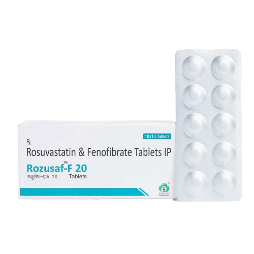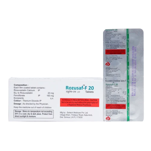 | Description: | ROZUSAF F 20 Tablet is a combination of Rosuvastatin 20 mg and Fenofibrate 160 mg. It is used for the management of mixed dyslipidemia and severe hypertriglyceridemia. Rosuvastatin reduces LDL (bad cholesterol), while Fenofibrate significantly lowers triglycerides and increases HDL (good cholesterol), offering comprehensive and high-intensity lipid control. |
