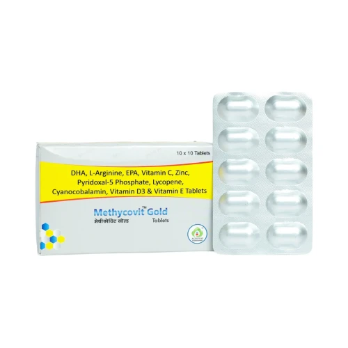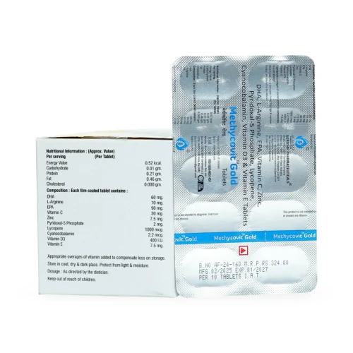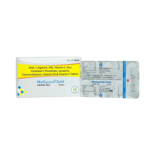 | Description: | METHYCOVIT GOLD TABLET is a premium health supplement enriched with essential vitamins and minerals, including Vitamin B12, Folic Acid, and Zinc. It is specially formulated to enhance energy, improve immunity, and support overall body function. This tablet helps in combating fatigue, improving cognitive health, and supporting the nervous system, making it an ideal supplement for people with vitamin deficiencies or those seeking overall health and vitality. |