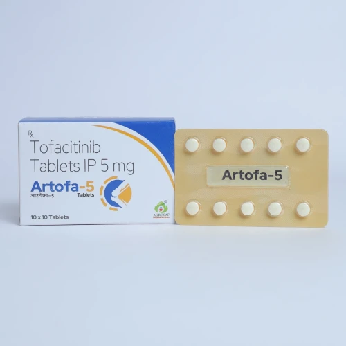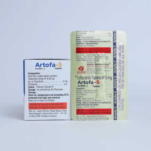 | Description: | ARTOFA-5 Tablet contains Tofacitinib 5mg, an oral Janus kinase (JAK) inhibitor used for the treatment of autoimmune conditions such as rheumatoid arthritis, psoriatic arthritis, and ulcerative colitis. Tofacitinib works by selectively inhibiting JAK enzymes, which play a key role in the inflammatory process, thereby reducing inflammation, pain, and joint damage, and improving overall mobility and quality of life. |