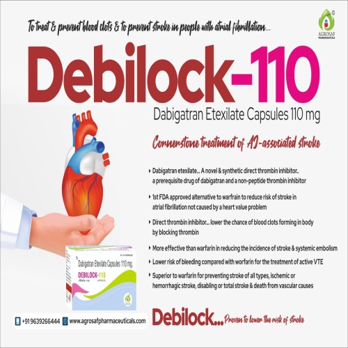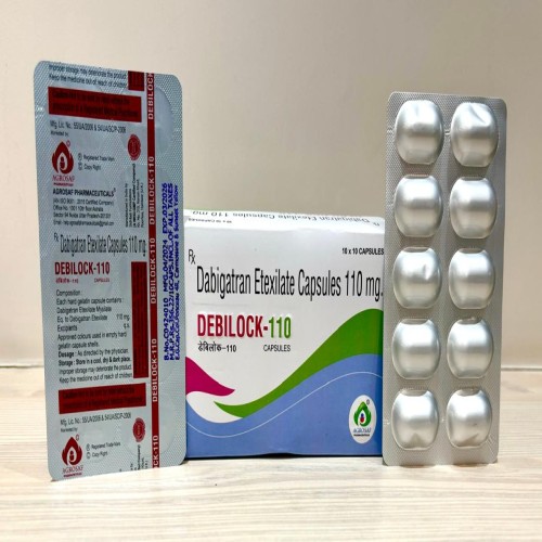 | Description: | DEBILOCK 110 Capsule contains Dabigatran Etexilate 110 mg, an oral anticoagulant (direct thrombin inhibitor) used to prevent and treat blood clots. It works by inhibiting thrombin, a key enzyme in the blood clotting process, thereby reducing the risk of clot formation. This medication is widely prescribed for preventing stroke in patients with atrial fibrillation, treating deep vein thrombosis (DVT), pulmonary embolism (PE), and preventing clot formation after orthopedic surgeries. DEBILOCK 110 offers effective anticoagulation without the need for routine INR monitoring. |