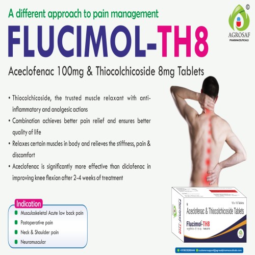 | Description: | FLUCIMOL TH 8 Tablet is a combination medication used to relieve pain, inflammation, and muscle spasms associated with musculoskeletal conditions. It contains Aceclofenac 100 mg and Thiocolchicoside 8 mg. Aceclofenac is a non-steroidal anti-inflammatory drug (NSAID) that helps reduce pain, swelling, and inflammation by blocking the production of prostaglandins responsible for pain and inflammation. Thiocolchicoside is a muscle relaxant that works on the central nervous system to relieve muscle stiffness and spasms, improving movement and flexibility. FLUCIMOL TH 8 Tablet is commonly prescribed for conditions such as Muscle Spasm, Back Pain, Cervical Spondylosis, Osteoarthritis, and other musculoskeletal disorders. |