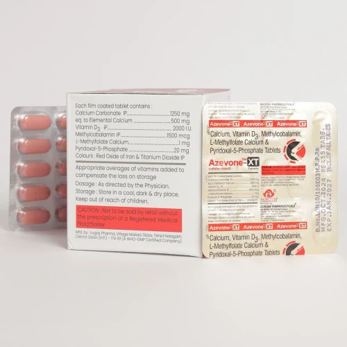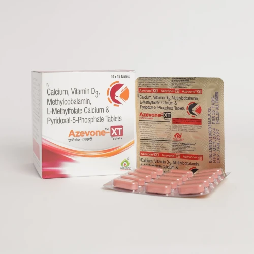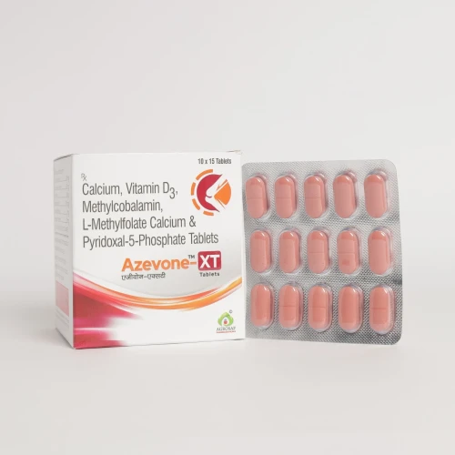 | Description: | AZEVONE XT Tablet is a comprehensive nutritional supplement formulated with Calcium Carbonate (1250 mg) equivalent to Elemental Calcium 500 mg, Vitamin D3 (2000 IU), Methylcobalamin (1500 mcg), L‑Methylfolate Calcium (1 mg), and Pyridoxal‑5‑Phosphate (20 mg). This advanced formula supports bone health, nerve function, and red blood cell formation. Calcium and Vitamin D3 help maintain strong bones and improve calcium absorption, while the active forms of Vitamin B12, Folate, and Vitamin B6 support nerve health and metabolic functions. AZEVONE XT Tablet is commonly used to manage calcium deficiency, nutritional deficiencies, and support neurological and bone health. |