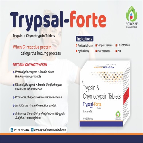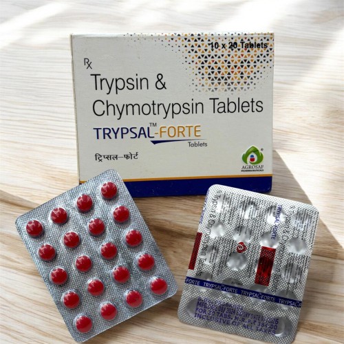 | Description: | TRYPSAL FORTE Tablet contains Trypsin and Chymotrypsin (100,000 AU), potent proteolytic enzymes used to reduce inflammation, edema, and pain in conditions such as post-surgical recovery, trauma, musculoskeletal injuries, and joint disorders. These enzymes help break down inflammatory mediators, improve circulation, and accelerate tissue healing, making them a widely used choice in orthopedic, surgical, and trauma care. |