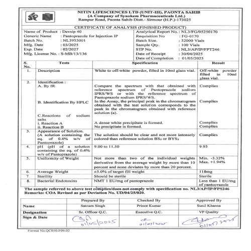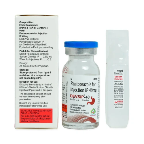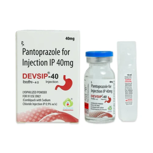| Description: | DEVSIP 40 Injection is a proton pump inhibitor (PPI) that helps reduce the amount of acid produced in the stomach. It is commonly prescribed to treat acid-related disorders such as gastroesophageal reflux disease (GERD), peptic ulcer disease, and Zollinger-Ellison syndrome. This medication not only alleviates symptoms like heartburn and indigestion but also supports the healing process of the stomach and intestinal lining. In hospital settings, DEVSIP 40 Injection is also used to prevent stress ulcers in critically ill patients and may be given before anesthesia to minimize the risk of acid aspiration. It is administered intravenously by a healthcare provider, typically when oral administration is not appropriate or feasible. The dosage and duration of therapy will be determined by the treating physician based on the severity of the condition and patient response. For optimal results, patients are advised to follow dietary modifications such as eating smaller, more frequent meals, and avoiding caffeine, spicy foods, and high-fat meals. Like all medications, DEVSIP 40 Injection may cause some side effects. Commonly reported ones include nausea, vomiting, dizziness, headache, flatulence, abdominal discomfort, diarrhea, and thrombophlebitis (inflammation of the vein at the injection site). These effects are generally mild and temporary, but you should inform your doctor if they persist or worsen. Prolonged use, particularly beyond one year, may increase the risk of certain complications such as bone fractures due to reduced calcium absorption. Patients at risk for osteoporosis may benefit from calcium and vitamin D supplementation as advised by their physician. Before starting DEVSIP 40 Injection, it is important to inform your doctor if you have significant liver dysfunction, are on HIV medication, have had allergic reactions to similar drugs, or have a history of osteoporosis. Pregnant and breastfeeding women should consult their doctor before using this injection. It is also recommended to avoid alcohol as it can trigger excessive acid production and worsen symptoms. If you experience drowsiness or dizziness after the injection, refrain from driving or operating heavy machinery. Alternate Brands : ๐ Pantocid IV 40mg โ Sun Pharmaceutical Industries Ltd ๐ Pantop IV โ Aristo Pharmaceuticals Pvt Ltd ๐ PAN 40 Injection โ Alkem Laboratories Ltd |