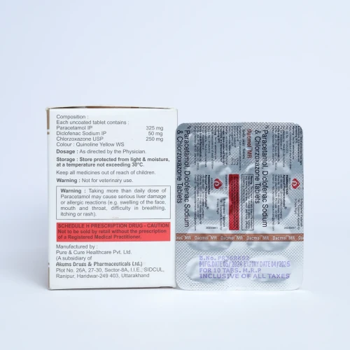 | Description: | DACMOL MR Tablet is a triple combination of Diclofenac Sodium 50mg (NSAID), Paracetamol 325mg (analgesic & antipyretic), and Chlorzoxazone 250mg (muscle relaxant). This formulation is designed to provide comprehensive relief from pain, inflammation, and muscle spasms. It is commonly used in the treatment of musculoskeletal disorders such as back pain, cervical pain, sprains, strains, and orthopedic conditions. The synergistic action helps reduce pain while relaxing stiff muscles, improving mobility and recovery. |