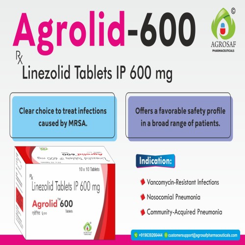 | Description: | AGROLID 600 Tablet contains Linezolid 600mg, a potent oxazolidinone-class antibiotic used for the treatment of serious bacterial infections caused by Gram-positive organisms. It is highly effective against resistant strains such as MRSA (Methicillin-resistant Staphylococcus aureus) and VRE (Vancomycin-resistant enterococci). Linezolid works by inhibiting bacterial protein synthesis, thereby stopping the growth and spread of infection. It is widely prescribed for infections like pneumonia, skin and soft tissue infections, and other complicated bacterial conditions, making it an essential antibiotic in hospital and clinical settings. |