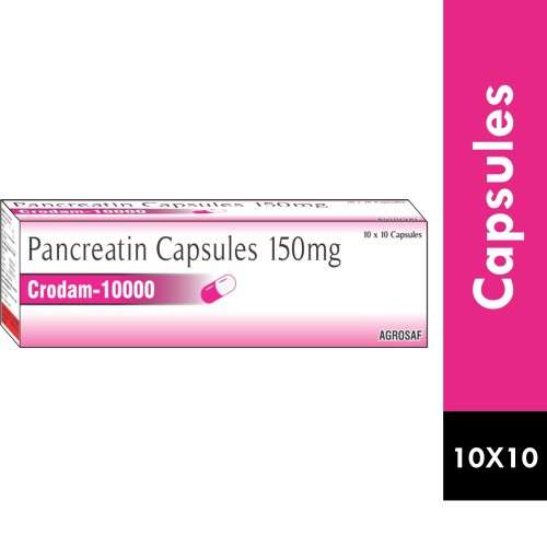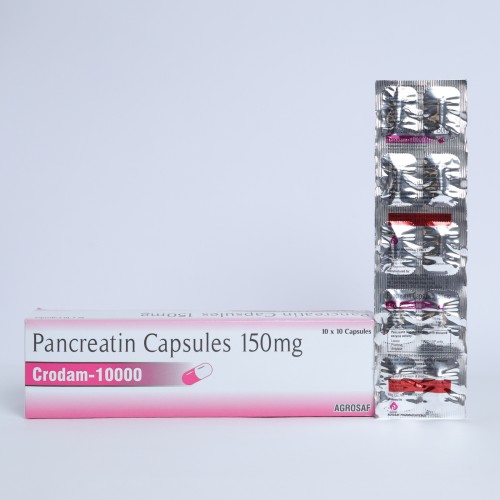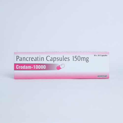 | Description: | CRODAM-10000 Capsule contains Pancreatin 150 mg, a digestive enzyme supplement used for the management of pancreatic enzyme deficiency. It contains a combination of enzymes such as lipase, amylase, and protease, which help in the digestion of fats, carbohydrates, and proteins. This medication is commonly prescribed for conditions like chronic pancreatitis, cystic fibrosis, and other malabsorption disorders, improving nutrient absorption and digestive function. |