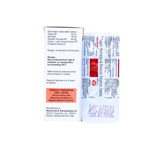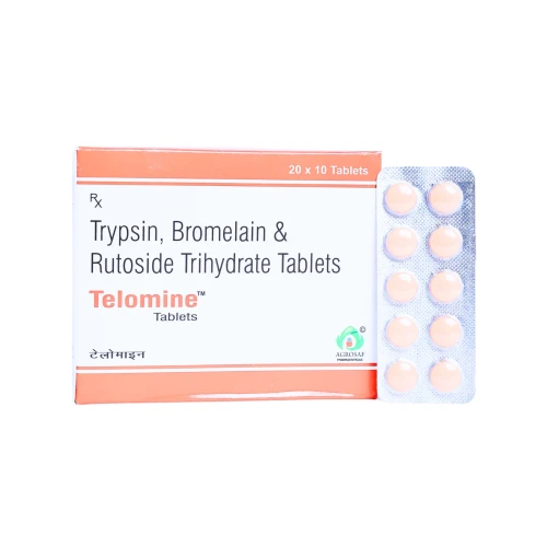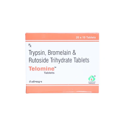 | Description: | TELOMINE Tablet is a proteolytic enzyme and bioflavonoid combination containing Trypsin 48mg, Bromelain 90mg, and Rutoside 100mg. This combination is used to reduce inflammation, swelling, and pain associated with post-surgical conditions, trauma, or musculoskeletal disorders. Trypsin and Bromelain help break down inflammatory mediators and aid in faster tissue healing, while Rutoside (a flavonoid) strengthens blood vessels and reduces capillary permeability, supporting vascular health. |
