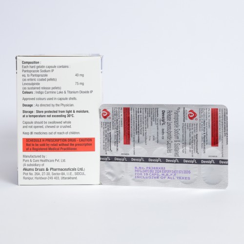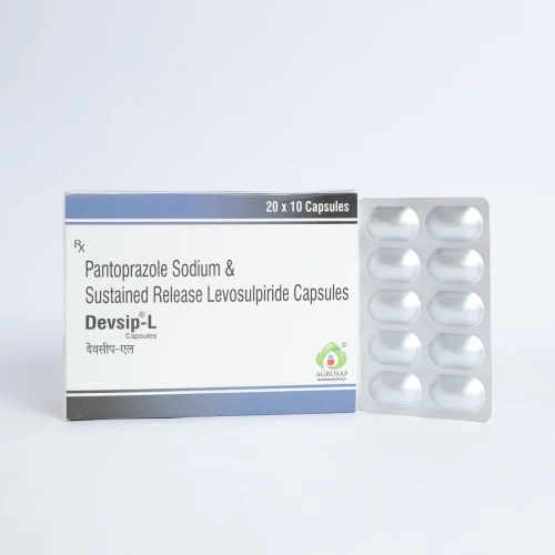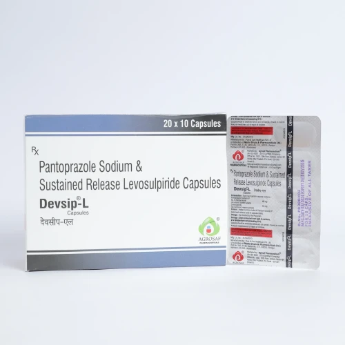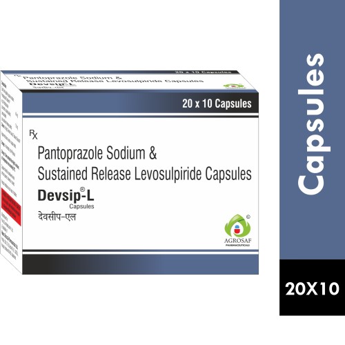| Description: | DEVSIP L Capsule is a combination medicine containing Pantoprazole (40 mg), a proton pump inhibitor (PPI), and Levosulpiride (75 mg), a prokinetic agent. It is used for the treatment of gastroesophageal reflux disease (GERD), acidity, dyspepsia, and related gastrointestinal disorders. Pantoprazole reduces stomach acid production, while Levosulpiride enhances gastrointestinal motility and helps relieve symptoms such as bloating, nausea, and fullness. This dual-action formulation provides effective and long-lasting relief from acid-related discomfort. |