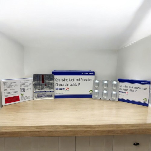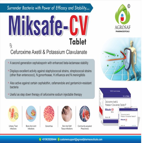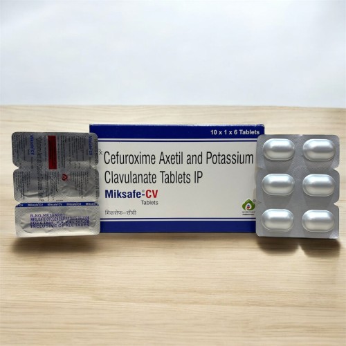 | Description: | MIKSAFE CV Tablet is a combination antibiotic containing Cefuroxime 500 mg and Clavulanic acid 125 mg. Cefuroxime is a second-generation cephalosporin antibiotic that works by inhibiting bacterial cell wall synthesis, while Clavulanic Acid enhances its effectiveness by blocking beta-lactamase enzymes produced by resistant bacteria. This combination provides broader antibacterial coverage and helps treat infections more effectively. MIKSAFE CV Tablet is commonly prescribed for respiratory tract infections, urinary tract infections, skin infections, and ear, nose, and throat infections. |