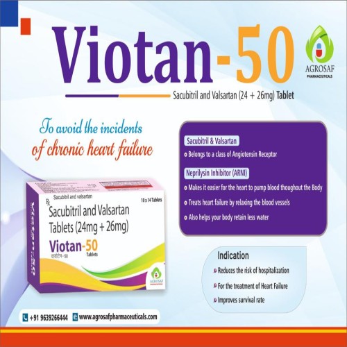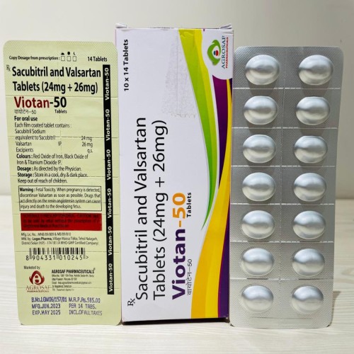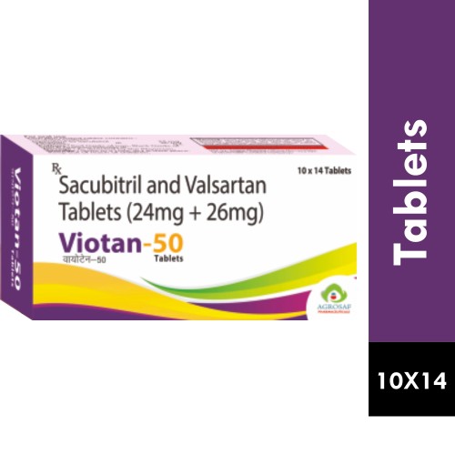 | Description: | VIOTAN-50 Tablet is a combination of Sacubitril 24 mg and Valsartan 26 mg. It is used for the treatment of chronic heart failure with reduced ejection fraction (HFrEF). Sacubitril enhances natriuretic peptides leading to vasodilation and fluid reduction, while Valsartan blocks angiotensin II receptors, reducing blood pressure and cardiac workload. This dual-action therapy improves heart function and reduces hospitalization risk. |