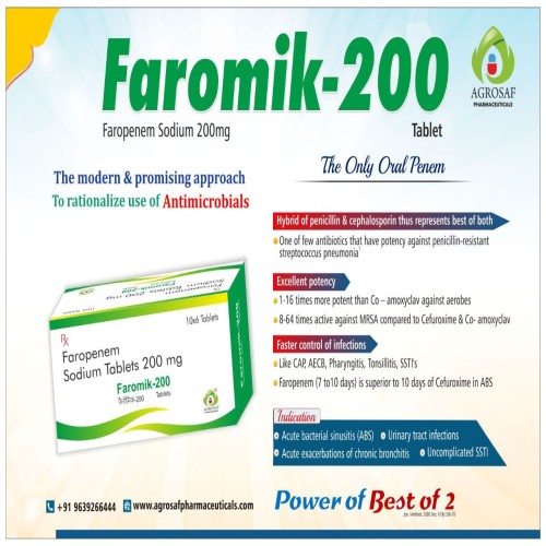 | Description: | FAROMIK 200 Tablet contains Faropenem 200mg, an oral broad-spectrum penem antibiotic used for the treatment of bacterial infections. It is effective against a wide range of gram-positive and gram-negative bacteria, making it suitable for infections such as respiratory tract infections, urinary tract infections, skin and soft tissue infections, and gynecological infections. Faropenem works by inhibiting bacterial cell wall synthesis, leading to the destruction of bacteria and helping the body fight infection effectively. FAROMIK 200 is commonly used in moderate to severe infections and offers reliable antibacterial coverage. |