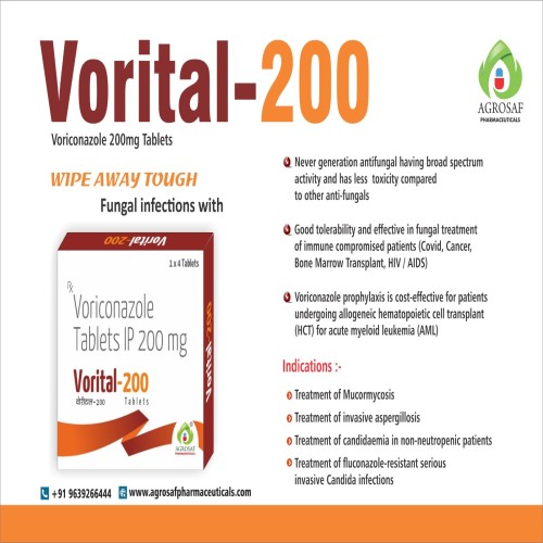 | Description: | VORITAL-200 Tablet contains Voriconazole 200mg, a broad-spectrum antifungal medication used for the treatment of serious fungal infections. It belongs to the triazole class of antifungals, which works by inhibiting fungal cell membrane synthesis, leading to the death of susceptible fungi. VORITAL-200 is prescribed for conditions such as invasive aspergillosis, candidemia, serious Candida infections, and other systemic fungal infections. |