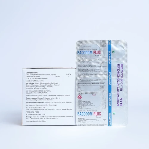| Description: | BACODOM PLUS Capsule contains Lactobacillus reuteri 100 mg, a beneficial probiotic that helps restore and maintain healthy gut flora. It is commonly used to support digestive health, manage diarrhea, bloating, and gastrointestinal imbalance, especially during or after antibiotic therapy. Lactobacillus reuteri works by promoting the growth of good bacteria, inhibiting harmful microbes, and improving overall gut function. It is widely used for maintaining digestive balance and enhancing immunity. |