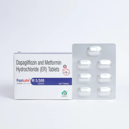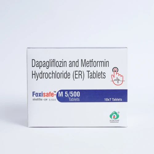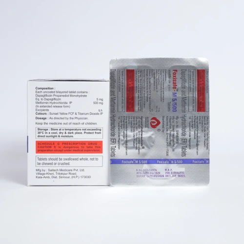 | Description: | FOXISAFE-M 5/500 Tablet is a combination antidiabetic medication containing Dapagliflozin 5 mg and Metformin Hydrochloride (Extended Release) 500 mg. It is used in the management of type 2 diabetes mellitus to improve glycemic control. Dapagliflozin, an SGLT2 inhibitor, works by increasing glucose excretion through urine, while Metformin reduces hepatic glucose production and improves insulin sensitivity. This dual-action formulation helps achieve better blood sugar control in adult patients. |