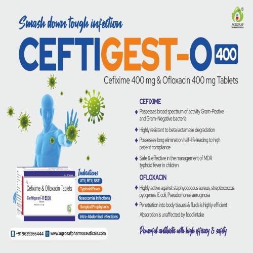 | Description: | CEFTIGEST O 400 TABLET is a broad-spectrum antibiotic combination containing Cefixime Trihydrate (400 mg) and Ofloxacin (400 mg). It is used to treat various bacterial infections affecting the respiratory tract, urinary tract, gastrointestinal system, and skin. Cefixime works by inhibiting bacterial cell wall formation, while Ofloxacin prevents bacterial DNA replication — together offering strong dual-action protection against infection. |