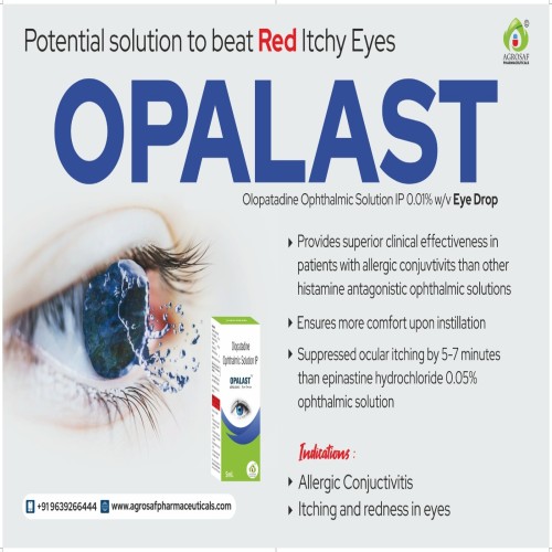 | Description: | OPALAST EYE DROPS contain Olopatadine (0.1% w/v), an antihistamine formulation used to relieve eye itching, redness, and irritation caused by allergic conjunctivitis or seasonal allergies. It works by blocking the effects of histamine a natural substance responsible for allergic reactions — providing quick and soothing relief from eye discomfort. |