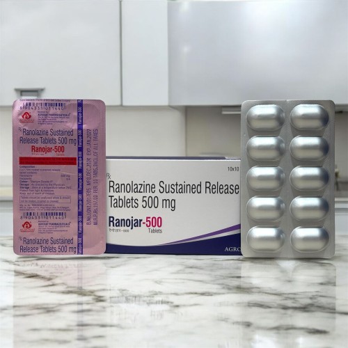 | Description: | RANOJAR-1000 Tablet contains Ranolazine 1000 mg in an extended-release formulation. It is used for the treatment of chronic stable angina (chest pain). The extended-release technology ensures sustained drug action, helping improve blood flow to the heart and optimize myocardial energy utilization without significantly affecting heart rate or blood pressure. |