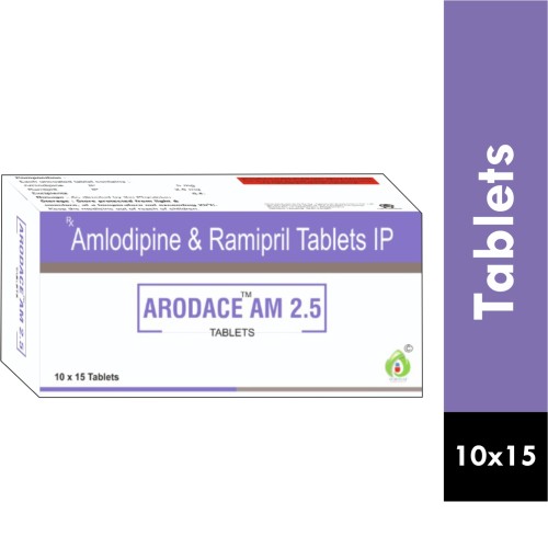 | Description: | ARODACE AM 2.5 Tablet is a combination of Ramipril 2.5 mg and Amlodipine 5 mg. It is used for the management of hypertension (high blood pressure) and prevention of cardiovascular complications. Ramipril relaxes blood vessels by inhibiting ACE, while Amlodipine dilates blood vessels by blocking calcium channels, providing effective dual-action blood pressure control. |