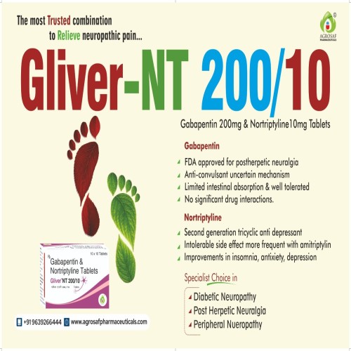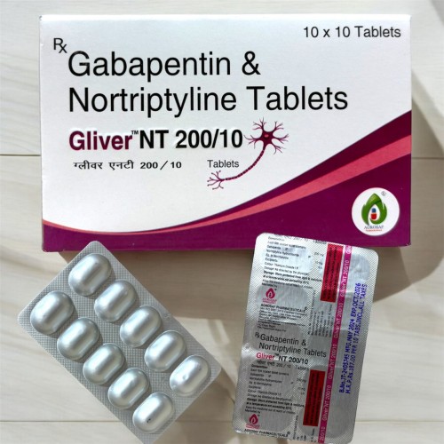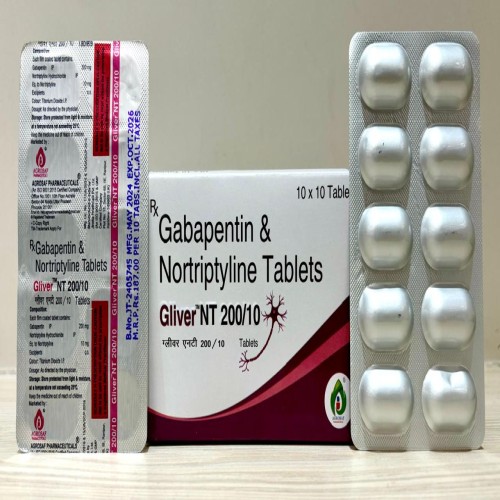 | Description: | GLIVER NT 200 Tablet is a combination medication containing: Gabapentin 200mg – an anticonvulsant that helps reduce abnormal nerve signal transmission, providing relief from neuropathic pain. Nortriptyline 10mg – a tricyclic antidepressant that enhances pain modulation, improves mood, and promotes better sleep quality. This combination is widely used in the management of moderate to severe neuropathic pain conditions such as diabetic neuropathy, post-herpetic neuralgia, and chronic nerve pain disorders. GLIVER NT 200 offers enhanced dual-action relief compared to lower strengths. |