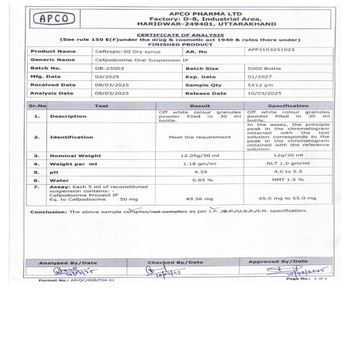 | COMPOSITION: | Cefpodoxime Proxetil (50mg) |