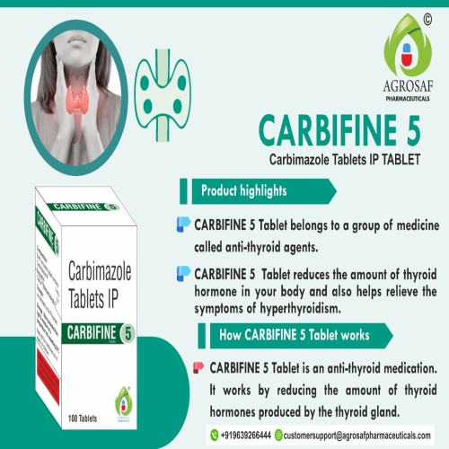 CARBIFINE 5 Tablet is used to treat hyperthyroidism by reducing the production of thyroid hormones.
