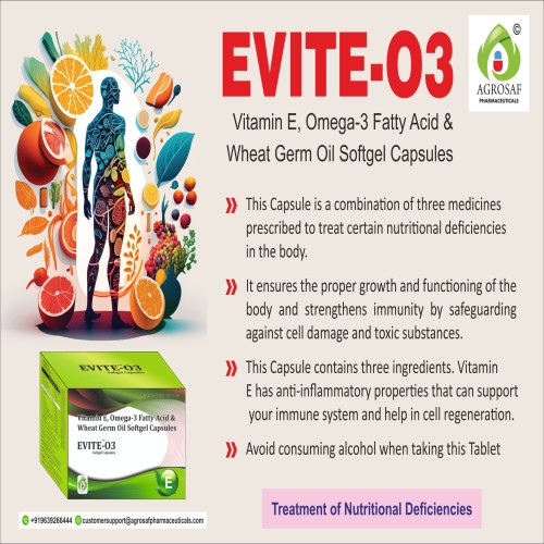 | Description: | EVITE O3 Softgel Capsules are a nutritional supplement combining Vitamin E, Wheat Germ Oil, and Omega-3 fatty acids to support overall health. Vitamin E acts as a potent antioxidant, Wheat Germ Oil provides essential nutrients, and Omega-3 fatty acids promote heart, brain, and joint health. This softgel is ideal for adults seeking improved immunity, cardiovascular support, and healthy skin. |