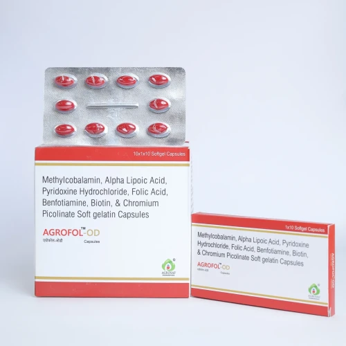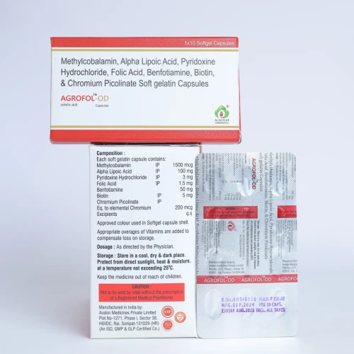 | Description: | AGROFOL-OD Capsule is a comprehensive neuro-nutritional formulation designed to support nerve health, metabolic function, and diabetic neuropathy management. It combines Methylcobalamin, an active form of Vitamin B12 essential for nerve regeneration, with Alpha Lipoic Acid, a powerful antioxidant that reduces oxidative stress. Benfotiamine and Pyridoxine support nerve function and energy metabolism, while Folic Acid and Biotin aid in cellular repair and overall neurological health. Chromium Picolinate helps regulate blood glucose levels, making this formulation highly beneficial for patients with diabetic neuropathy and metabolic disorders. |