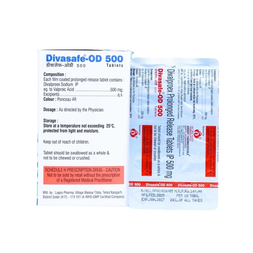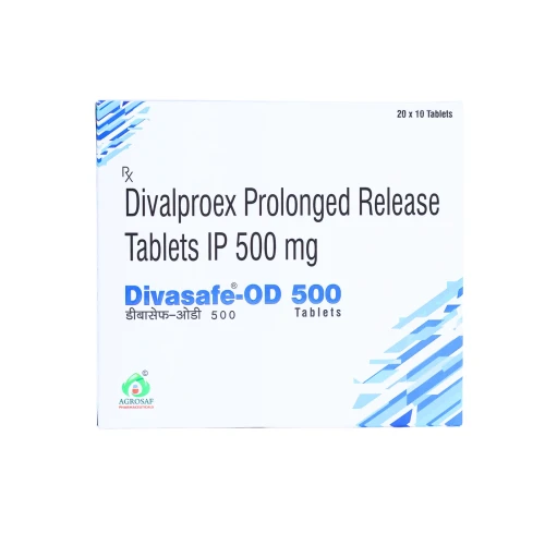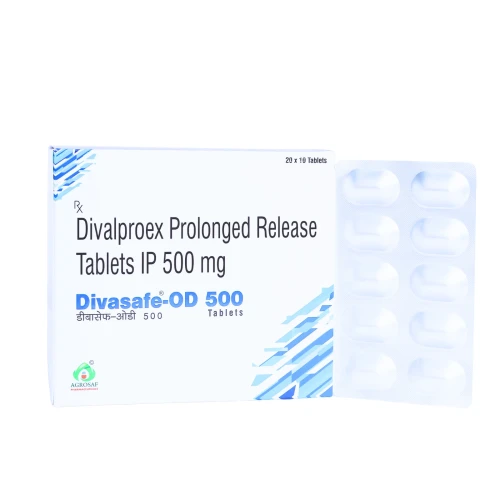 | Description: | DIVASAFE OD 500 Tablet contains Divalproex 500mg in an extended-release (OD – once daily) formulation. It is an anticonvulsant and mood stabilizer used in the treatment of epilepsy, bipolar disorder, and for the prevention of migraine headaches. The extended-release mechanism ensures a steady release of the drug over time, providing consistent therapeutic effects and improving patient compliance with once-daily dosing. |