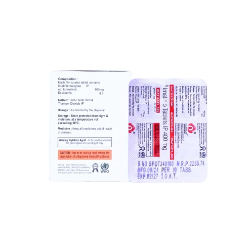 | How to Use: | Take IMATILATE-400 Tablet orally, as prescribed by an oncologist. Usually taken once daily with a meal and a full glass of water. Do not crush or chew the tablet. Follow the prescribed treatment schedule strictly. |