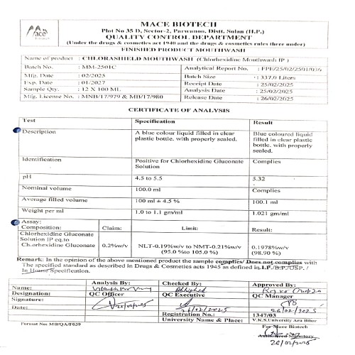 | COMPOSITION: | Chlorhexidine Gluconate (0.2% W/v) Mouth Wash |