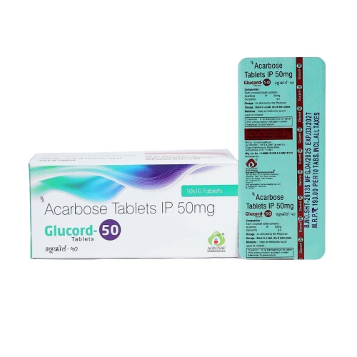| Description: | GLUCORD-50 Tablet is an oral anti-diabetic medication used to help manage blood glucose levels in individuals with type 2 diabetes. It contains Acarbose 50 mg, an alpha-glucosidase inhibitor that works by slowing the digestion and absorption of carbohydrates in the intestine. By delaying carbohydrate breakdown, GLUCORD-50 Tablet helps control post-meal blood sugar spikes and improves overall glycemic control. It is usually prescribed along with dietary changes and regular physical activity for the management of Type 2 Diabetes Mellitus. GLUCORD-50 Tablet helps maintain stable blood glucose levels and may reduce the risk of diabetes-related complications when taken as advised by a healthcare professional. |