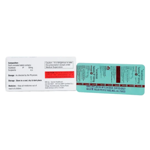 | Product Benefits: | Helps control post-meal blood sugar spikes. Slows carbohydrate digestion and glucose absorption. Supports effective glycemic control. Can be used along with other anti-diabetic medications if required. Helps reduce the risk of long-term diabetes compl |