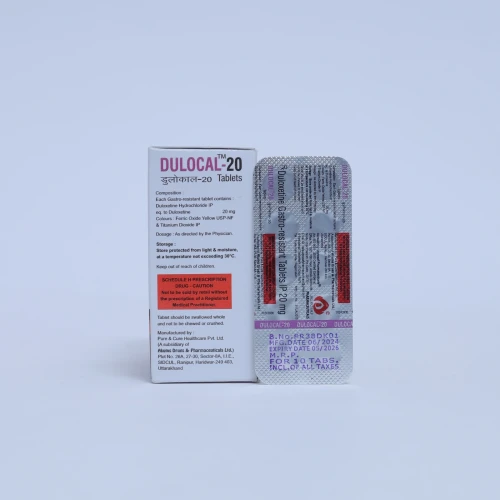 | Description: | DULOCAL-20 Tablet contains Duloxetine 20mg, a serotonin-norepinephrine reuptake inhibitor (SNRI) used for the treatment of depression, generalized anxiety disorder, and neuropathic pain. It works by increasing serotonin and norepinephrine levels in the brain, helping to improve mood, reduce anxiety, and relieve nerve-related pain. The 20mg strength is often used for initial dosing, dose titration, or in patients requiring lower therapeutic doses. |
