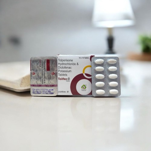 | Description: | TOLIFAX-D Tablet is a combination of Tolperisone 150mg (muscle relaxant) and Diclofenac 50mg (NSAID), designed for effective relief from muscle pain, inflammation, and spasm. Tolperisone acts on the central nervous system to relax muscles and reduce stiffness, while Diclofenac reduces pain and inflammation at the site of injury. This dual-action combination is highly effective in managing musculoskeletal conditions such as back pain, cervical spondylosis, and muscle injuries. |