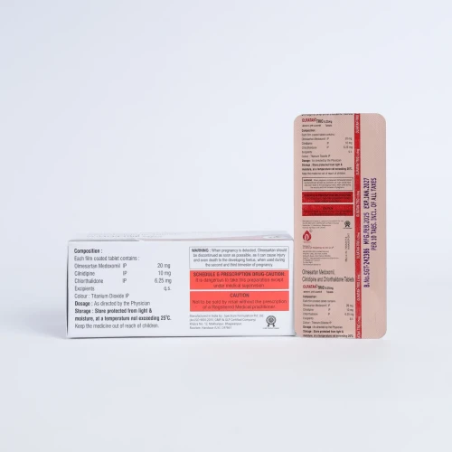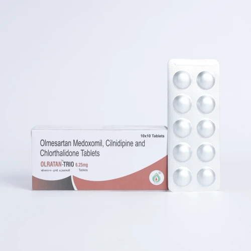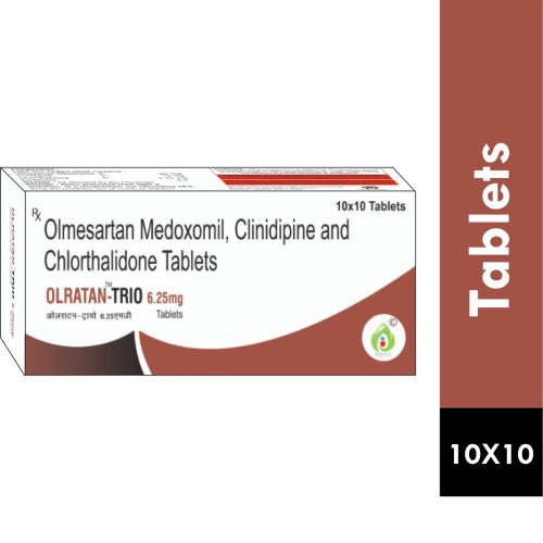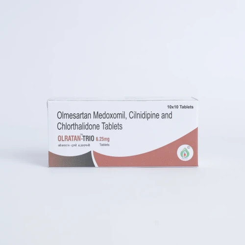 | Description: | OLRATAN-TRIO 6.25 Tablet contains a combination of Olmesartan Medoxomil 20 mg, Cilnidipine 10 mg, and Chlorthalidone 6.25 mg. This triple-action antihypertensive formulation is designed for patients who need moderate blood pressure control with a lower dose of diuretic. Olmesartan relaxes blood vessels by blocking angiotensin II, Cilnidipine dilates arteries to reduce vascular resistance, and Chlorthalidone promotes sodium and water excretion to manage fluid retention, providing effective hypertension management and cardiovascular protection. |