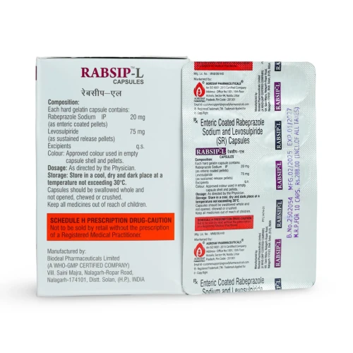 | Description: | RABSIP L Capsule is a combination medicine designed for the management of gastrointestinal disorders such as acid reflux, dyspepsia, and delayed gastric emptying. It contains Rabeprazole 20 mg, a proton pump inhibitor (PPI) that reduces stomach acid production, and Levosulpiride 75 mg, a prokinetic agent that enhances gastric motility and improves lower esophageal sphincter function. This dual-action formulation provides effective relief from heartburn, bloating, nausea, and indigestion, improving overall digestive comfort. |