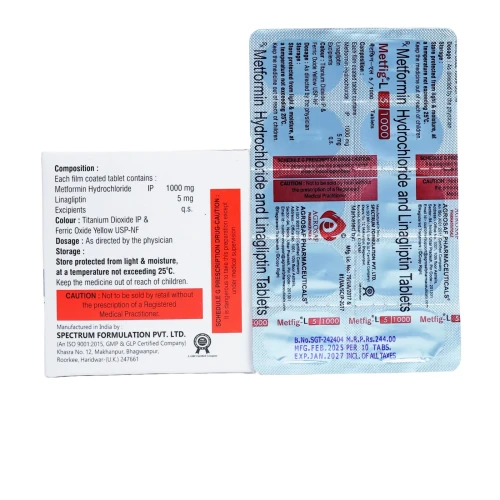 | Description: | METFIG-L 5/1000 Tablet is a combination antidiabetic medication containing Linagliptin 5mg and Metformin 1000mg. It is formulated for the effective management of type 2 diabetes mellitus in patients who require combination therapy for better glycemic control. Linagliptin, a DPP-4 inhibitor, enhances incretin hormone activity to increase insulin secretion and decrease glucagon levels, while Metformin, a biguanide, reduces hepatic glucose production and improves insulin sensitivity. This dual-action approach helps control both fasting and postprandial blood glucose levels and supports long-term diabetes care. |