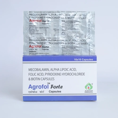 | Description: | AGROFOL FORTE Capsule is an advanced neuro-nutritional supplement formulated with Mecobalamin (Vitamin B12), Alpha Lipoic Acid, Folic Acid, Pyridoxine (Vitamin B6), and Biotin. This high-strength formulation is designed to support nerve health, manage diabetic neuropathy, and correct vitamin deficiencies. Alpha Lipoic Acid provides powerful antioxidant protection, while Mecobalamin aids in nerve regeneration and repair. Biotin further supports nerve function and metabolic health. This combination is widely recommended for patients with nerve pain, tingling, and numbness. |