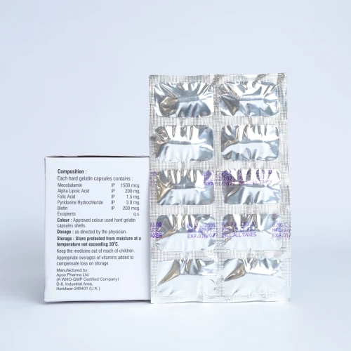 | COMPOSITION: | Each Hard Gelatin Capsules Contains : Mecobalamin Ip 1500 Mcg. + Alpha Lipoic Acid Ip 200 Mg. + Folic Acid Ip 1.5 Mg. + Pyridoxine Hydrochloride Ip 3.0 Mg. + Biotin Ip 200 Mcg. Excipients Q.s. Colour: Approved Colour Used Hard Gelatin Capsules shells. |