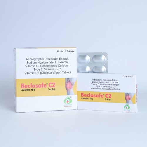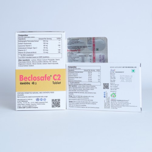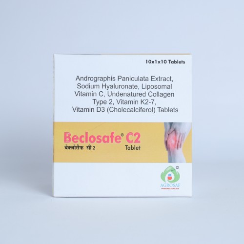 | Description: | BECLOSAFE C2 Tablet is an advanced joint health and bone support supplement formulated with natural anti-inflammatory extracts, collagen, and essential vitamins. It contains Andrographis paniculata extract 250 mg, Sodium Hyaluronate 100 mg, Vitamin C (Liposomal) 80 mg, Undenatured Type II Collagen 40 mg, Vitamin K2 (MK-7) 55 mcg, and Cholecalciferol (Vitamin D3) 15 mcg. This combination helps maintain joint flexibility, improves cartilage health, and supports bone strength. Sodium Hyaluronate promotes joint lubrication, while undenatured collagen type II supports cartilage structure. Liposomal Vitamin C enhances collagen synthesis and provides antioxidant protection. Vitamin D3 and Vitamin K2 work together to improve calcium utilization and maintain strong bones. BECLOSAFE C2 Tablet is commonly recommended for people suffering from Osteoarthritis, Joint Pain, Cartilage Degeneration, and Bone Weakness. |