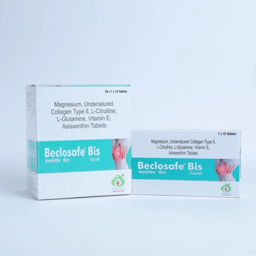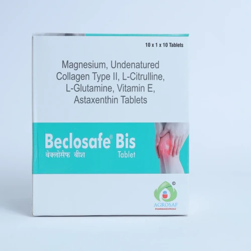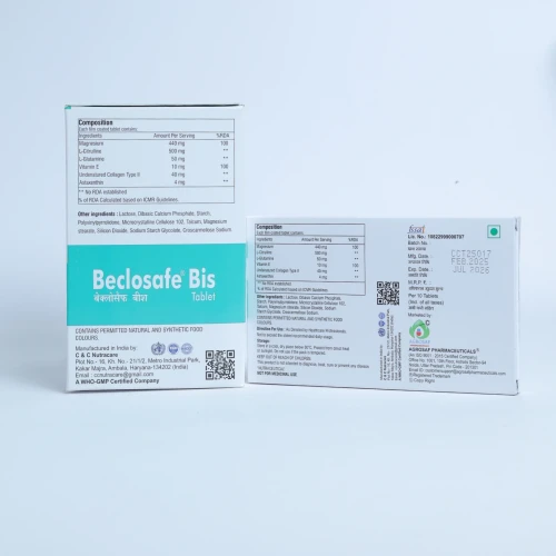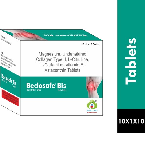 | Description: | BECLOSAFE BIS Tablet is a nutraceutical formulation designed to support joint health, muscle function, and overall physical performance. It contains Magnesium 440 mg, Undenatured Type II Collagen 40 mg, L-Citrulline 500 mg, L-Glutamine 50 mg, Vitamin E 10 mg, and Astaxanthin 4 mg. Magnesium plays a vital role in muscle relaxation and nerve function, while undenatured collagen type II helps maintain cartilage integrity and joint flexibility. L-Citrulline improves blood circulation and supports muscle endurance, and L-Glutamine aids in muscle recovery and tissue repair. Vitamin E and Astaxanthin provide powerful antioxidant protection that helps reduce oxidative stress and inflammation. BECLOSAFE BIS Tablet is commonly recommended for individuals experiencing Osteoarthritis, Joint Pain, Muscle Fatigue, and Inflammation. |
